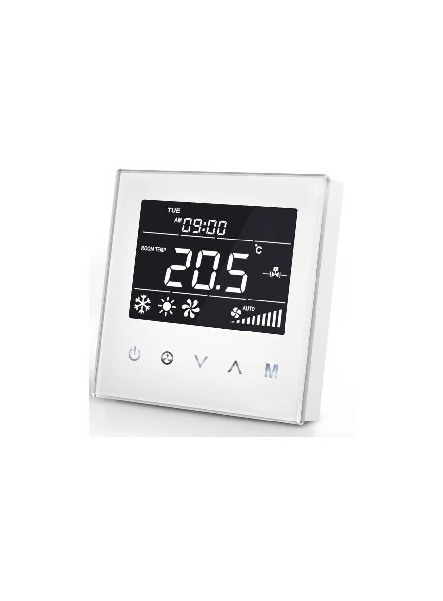Slimme thermostaat in wit voor bediening van een fancoil (lucht)verwarmingsunit waarmee je kunt koelen en verwarmen. Maak slanke verwarmingsschema's om de ruimte alleen te verwarmen/koelen als dat gewenst is.